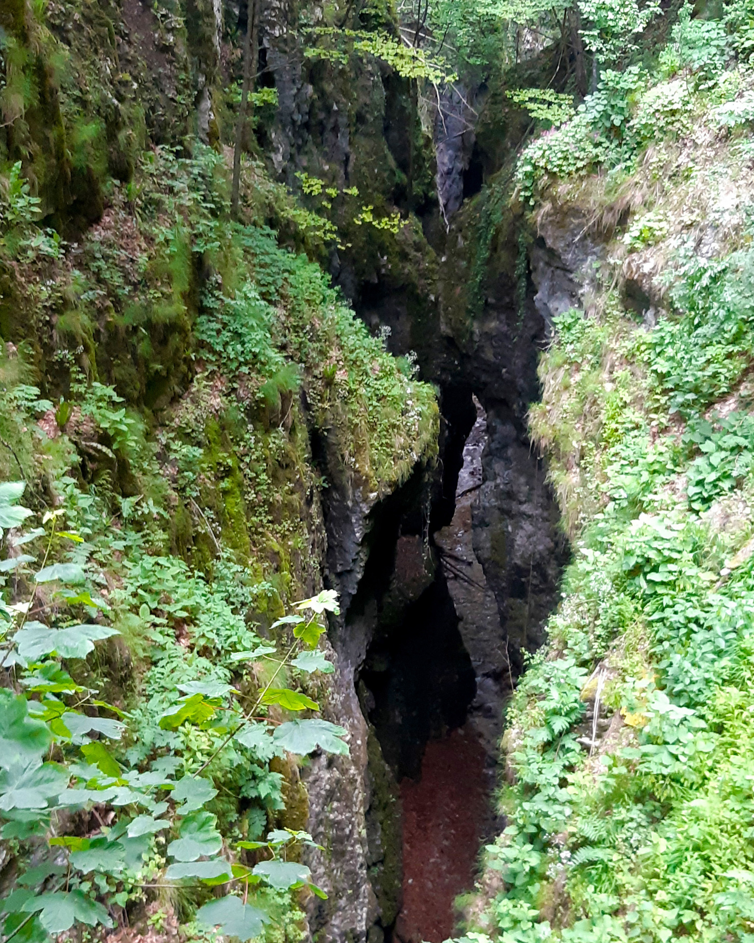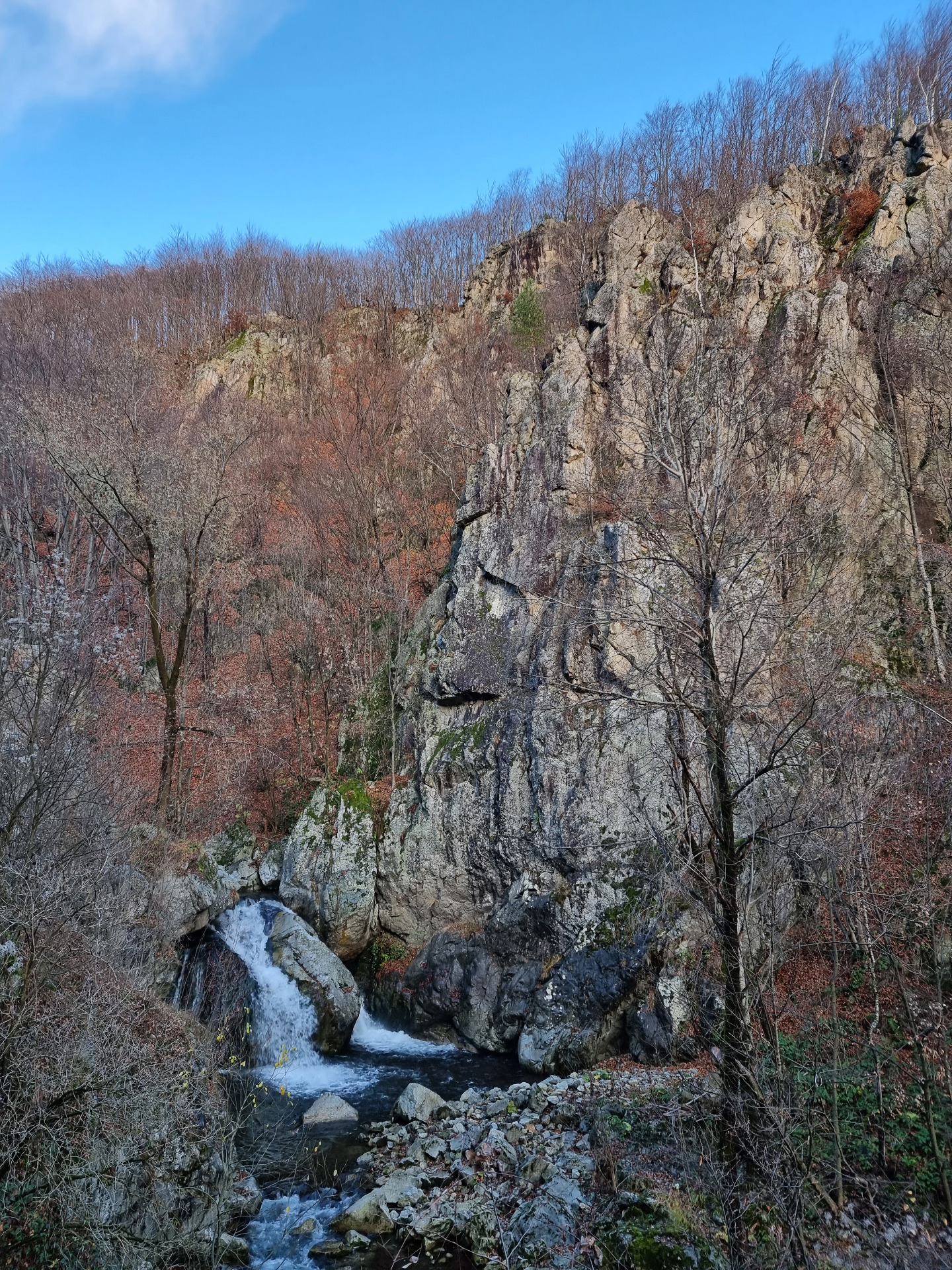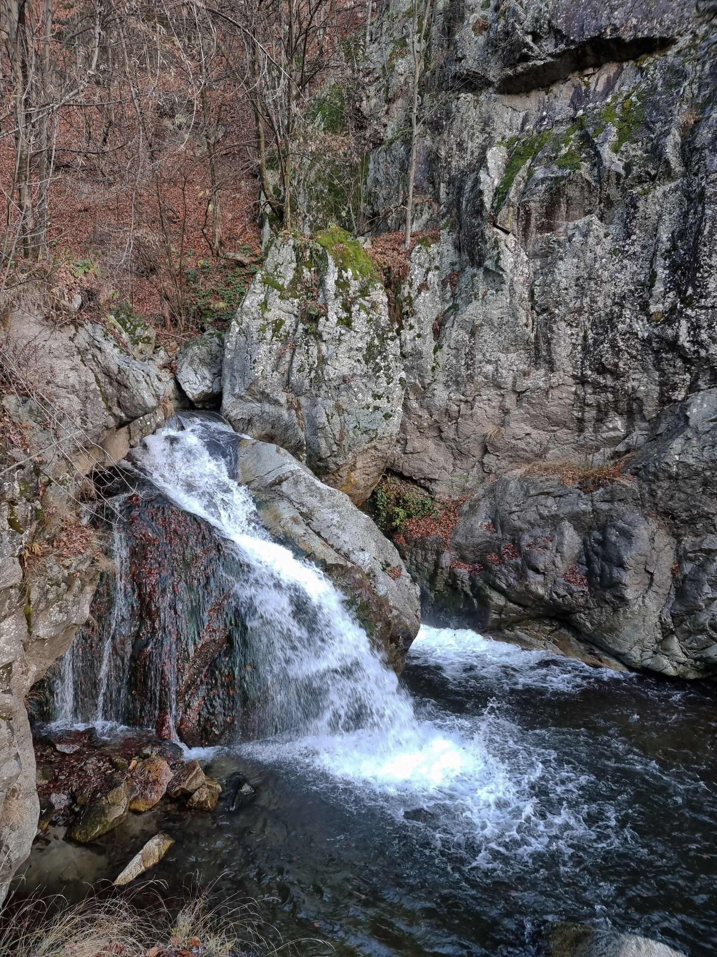 În mijlocul peisajului încântător zărim chiar din drum, undeva pe stânga, căderile de apă. Cu cât ne apropiem, cu atât e mai mult zgomot și mai mult farmec. De jur împrejur stânci cu forme care mai de care și pădurea calmă într-o tăcere ruptă doar de zbaterea apelor. Sunt trei cascade una peste alta.
